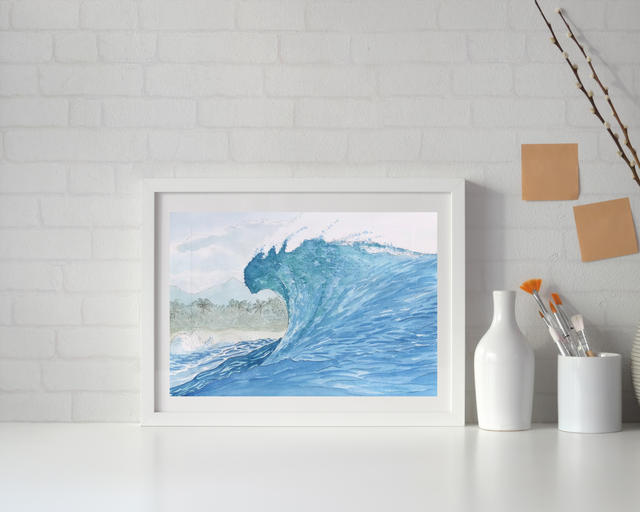 Cette aquarelle immortalise le spot mythique de la pointe de Trois Bassins sur la côte ouest de La Réunion. L'œuvre capture la beauté sauvage de ce lieu emblématique du surf réunionnais, où les vagues puissantes rencontrent les falaises volcaniques.